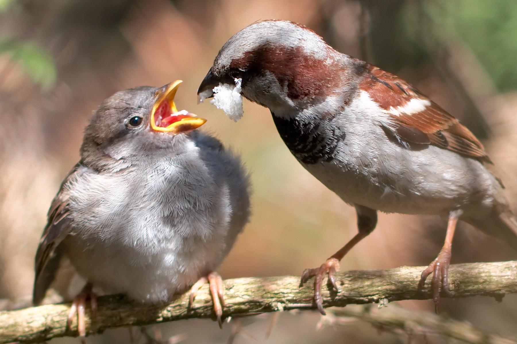 Os filhotes de pardal abandonam o ninho entre 10 e 21 dias após o seu nascimento. Portanto, um filhote de pardal fora do ninho nem sempre representa a necessidade de cuidados humanos. Enquanto eles estão no ninho, são alimentados com pequenos artrópodes. Após esse período passam a uma dieta vegetariana