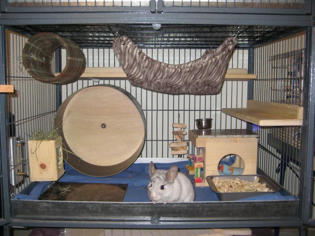 A gaiola ideal para a chinchila deve ter, no mínimo, dois andares. O animal deve ter espaço suficiente para se movimentar com facilidade. Incluir uma toca na gaiola é o ideal, pois o pet necessita de um espaço onde se possa esconder e refugiar dos barulhos. É essencial incluir um bebedouro, um comedouro e um porta-alfafa na gaiola. A cama da chinchila pode ser feita de serragem de pinheiro seca em estufa, para ficar bem macia.