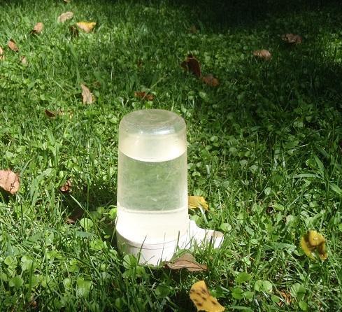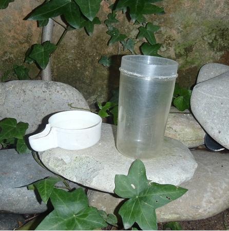 Agora, para que não caia água pela lingueta por onde bebem os pássaros, gire o bebedouro na direção contrária a esta lingueta. Desta forma, ao girá-lo, a lingueta estará sempre voltada para cima para que a água que está no copo não caia.