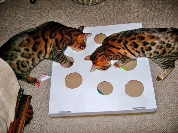 Pegue na caixa e desenhe várias circunferências usando o copo e criando um mosaico. Depois pegue na tesoura ou estilete e recorte para fazer os buracos; quando tiver todos os buracos feitos coloque sua bola favorita dentro ou outro brinquedo que goste para ver como ele se diverte. Seu gato tentará pegar a bola enfiando a pata nos orifícios, mas ela aparecerá e desaparecerá entre os diferentes buracos. É um brinquedo maravilhoso para o seu animal de estimação.