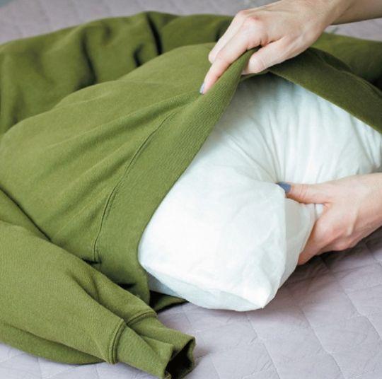 Agora preencha a barriga do moletom com a almofada ou com o seu recheio. Certifique-se que a almofada preenche toda a área da barriga do moletom, para que a cama do seu cachorro fique o mais confortável possível. Depois de encher, deverá unir o fundo do moletom e costurar à mão ou na máquina de costura.