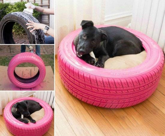 Um pneu usado também pode ser usado para fazer uma cama para o seu pet. Basta apenas lavá-lo bem e pintá-lo de uma cor a seu gosto. Depois encha o buraco do pneu com almofadas e já tem a cama para o seu pet pronta!