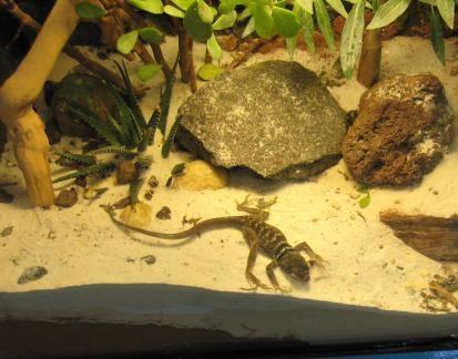 De acordo com as exigências da espécie, você terá de adquirir um terrário proporcional ao tamanho do lagarto na fase adulta, vertical ou horizontal e com espaço para um lago artificial ou não. Escolha um de vidro e com tampa.
