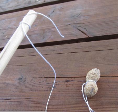 Pegar um esquilo é simples com esta invenção, a primeira coisa que deve fazer é amarrar um extremo da linha ao pedaço de madeira e o outro extremo ao amendoim inteiro.