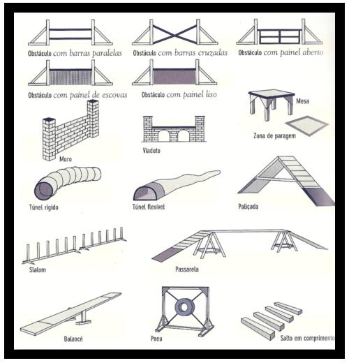 Os obstáculos mais comuns nas competições de agility são as gangorras, a mesa, o muro os jogos de números, a passarela, o pneu, os túneis, a rampa, os saltos e o slalom.