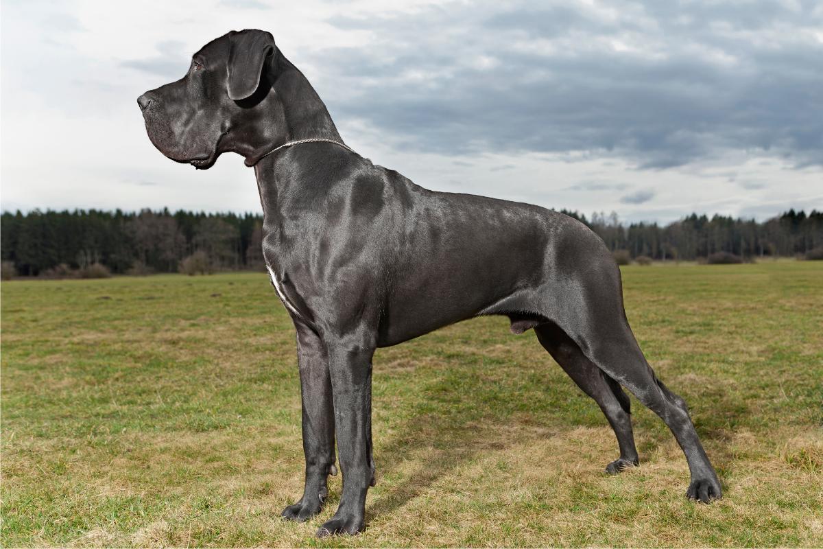 Também conhecido como grande dinamarquês, é um cão gigante e muito popular. Os machos atingem até 90 cm na cernelha, enquanto as fêmeas, um pouco menos. Seu corpo é musculoso, e um macho pode pesar entre 54 kg e 90 kg. É um cão tranquilo e afável, mas com uma expectativa de vida muito curta: vive entre 6 e 8 anos.