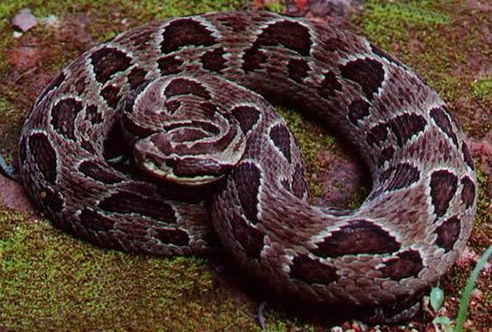 Surucucu (Lachesis muta) - considerada a maior cobra peçonhenta da América do Sul, pode medir até 4,5 m de comprimento. Vive em florestas densas, principalmente na Amazônia.